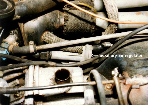 On the Type 4 engine, the auxiliary air regulator is located immediately behind the intake air distributor. It's a cylindrical object with an electrical connection on one end and two large air hoses. One hose comes from the S-boot after the air flow meter and goes into one end of the auxiliary air regulator and the other hose goes from the regulator to the intake air distributor.