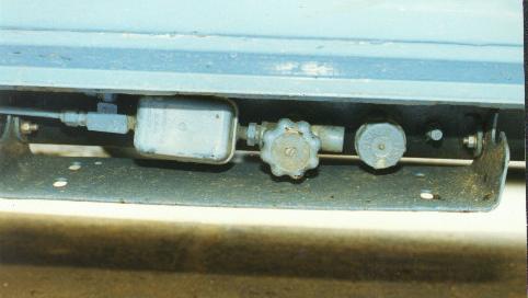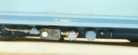 The photo above shows the tank on the ground. You can see that the tank mounts are open-ended. The various things on the tank, from right to left, are: The 80% valve, the fill valve, the on/off valve, the regulator, and the "splitter" which simply puts the propane into two lines, one for the stove and one for the refrigerator.