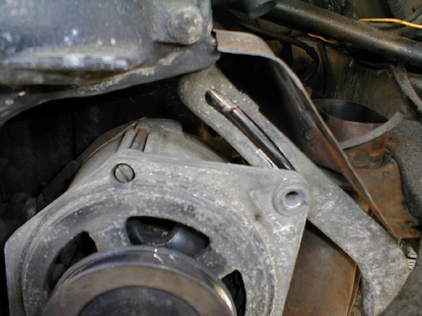 When you get back topside, you need to now pull the lower bolt out. It helps if you get it started by levering it out a little. Wedge a screwdriver in between the bolt and the tin and lever it out, then you should be able to pull it out fairly easily. May have to support the alternator as you do so so it doesn't cause the bolt to bind up. Set the bolt aside for later.