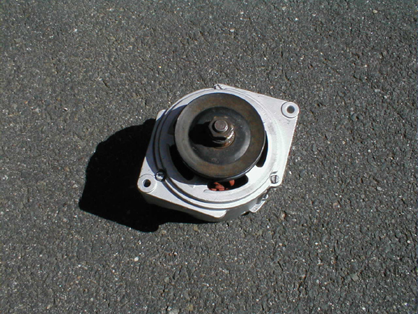 This is the point where I needed a little professional help. I could not get the pulley nut off of the old alternator to swap the pulley onto the new one. So I took the new alternator and the old alternator and my gear puller (just in case) up to Pep Boys and had one of their guys do the swap with an impact wrench. I noticed that the new alternator had a slot in the shaft for a woodruff key. When I pulled the pulley off the old alternator, there was a place for a woodruff key, but no key. Hmm. Not having any spare ones lying around, I had the guy just go ahead and mount the pulley to the new alternator. It worked for at least 10,000 miles on the old one so hopefully it will continue to work with the new one. Had him zap the pulley nut on nice and tight. That may not be the best decision though, so if your old alternator has the woodruff key, by all means transfer it to the new one. The idea is to keep the pulley from spinning relative to the shaft. I've not had a problem like that but that doesn't mean it's a good idea to leave it out.