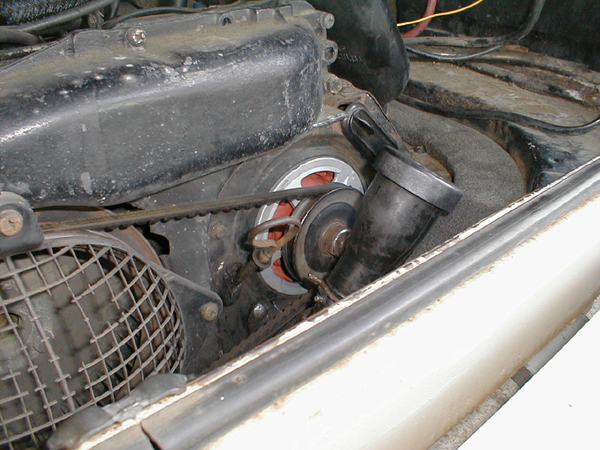 Now you might as well go ahead and put the belt back on while the oil filler tube is out of the way. Loosen the adjusting bolt if you need to, then slip the belt on. If you can't quite get it on, cranking the engine forward helps. Then lever the alternator to put appropriate tension on the belt (the book says the belt should deflect 5/8" or 15mm) and then tighten the adjusting bolt.