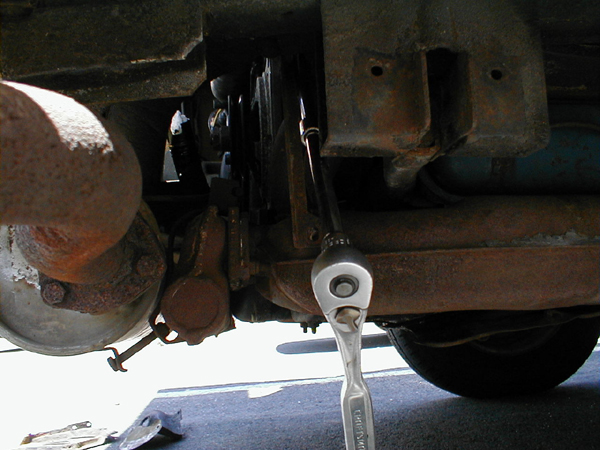 When you get back topside, you need to now pull the lower bolt out. It helps if you get it started by levering it out a little. Wedge a screwdriver in between the bolt and the tin and lever it out, then you should be able to pull it out fairly easily. May have to support the alternator as you do so so it doesn't cause the bolt to bind up. Set the bolt aside for later.