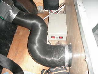 Armed with this knowledge which I soaked up to be on the safe side, I decided it was time to find out if this heater was for real by testing it. Please make sure you are performing your test safely. You are working with fuel, a battery and a fan, which spins at high speed (more than 4800 rpm). You do not want to set your car or garage/house on fire, nor do you want to chop up your fingers with the heater's fan. I followed the hints in Ron's articles to set up a test situation. I also connected the temperature-regulating switch to assess if everything performed ok. After the pump had sucked enough fuel from the secure container (a 5 liter plastic jerry can) to deliver some to the heater, it started up like a dream... And there I was; on my driveway at 8:20 PM on a November night jumping up & down... This hobby is sure more involving than stamp collecting!!!