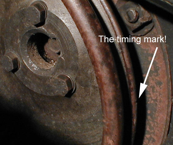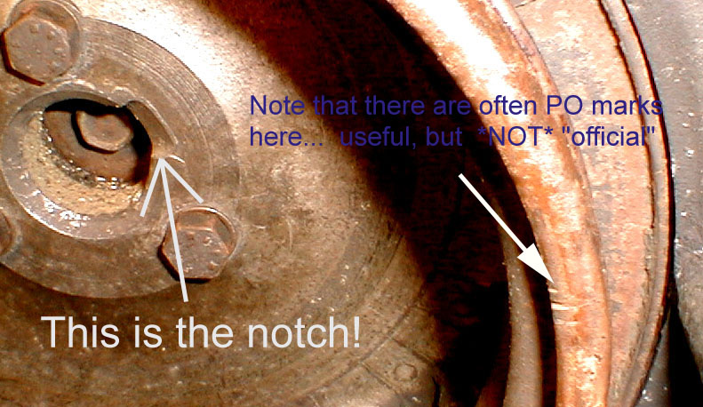 Once you have found the notch follow a line from the center of the hub, thru the right (clockwise) edge of the notch out to the rim. You may find marks there. These were put there by a PO and are *not* the timing mark, but are a good indication that you are in the neighbothood! :-)