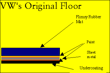 The following graphics show the typical protection VW designed into floors and walls. Little effort was made to inhibit corrosion, or stop the transmission of noise and heat. Sheet metal is relatively bare to the elements, and easily transmits heat and noise to the cabin.