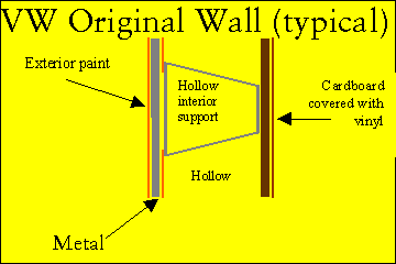 Metal conducts heat and noise freely. � Large sheets of metal reverberate after the originating noise has ceased. � Untreated steel corrodes quickly. � Certain types of padding can absorb noise and shock. � Certain types of padding can reflect heat back into the passenger compartment. � Insulation can trap heat, keeping it where you want it. � Certain types of asphalt/rubber emulsions and tiles can eliminate reverberation and noise transmission in metal. � Certain types of asphalt/rubber emulsions can seal metal to prevent rust. � VW put nearly ZERO effort into insulating/noiseproofing their air-cooled vehicles. � The heater system in our VW was of intelligent design, but was poorly executed. � Our project vehicle was virtually rust free (This was NOT a "recovery" effort, but a prevention effort). � Redesigning motor mounts (ala the 1980-1983 Vanagon) to eliminate noise would have helped, but was outside the scope of our effort. �