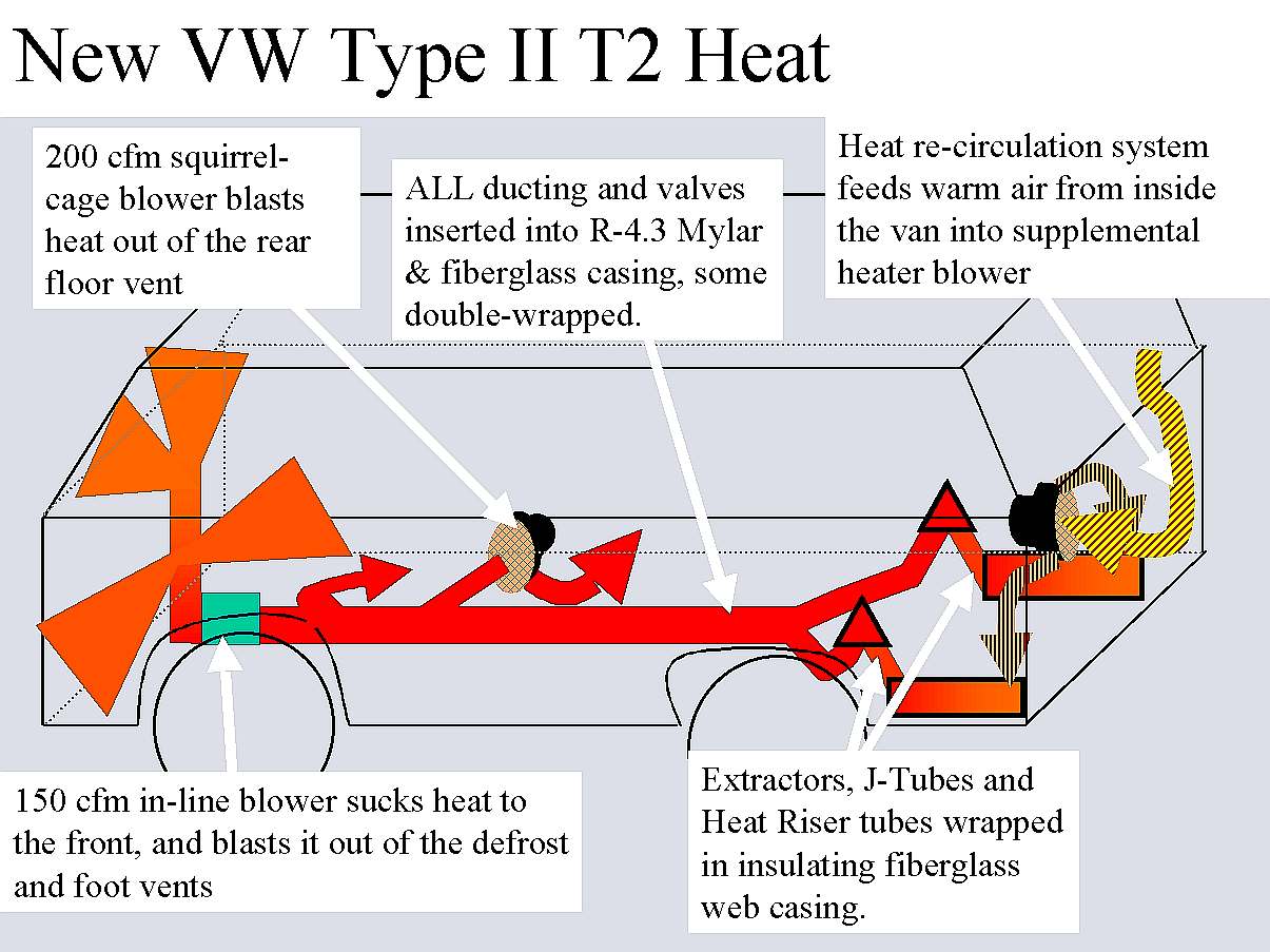 I built a website that chronicles to whole project http://www.bulley-hewlett.com/VWindex . Since some of the early parts of the project contributed to our heater�s performance (like fully insulating the body), I would recommend at least scanning the pages from start to finish, so you get the baseline info you need. You don�t need to do all the stuff to drastically improve your heater�s performance. The "heat" portion of the site is only partially complete, but I will fill in some details below. There is a graphic (on the heat page) that shows all the components of the stock system. And the changes we made. The text below relates to that graphic.