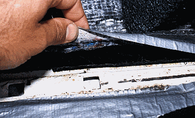 This Q-Pad is installed on the wheel arch under the driver's seat. It is that thick black tile stuck to the sheet metal. (Yes, that is my actual hand, not a stuntman or body double's�) We covered this area with NASA Insulation, and duct taped the edges. We did not order the replacement rubber mat to cover all this, although that was the plan.
