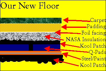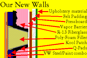 For the sake of drawing, it would appear that our floors and walls are now 6" thick. Not the case. In fact, those of you who have seen this bus (at Buggout, etc.) can testify, you cannot see tell tale signs of this insulation, only a nicely upholstered interior. The clue comes you slam a door, and hear the solid, "thunk", or ride down the highway, and talk in conversational tones at 70 mph.