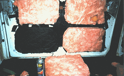 The left photo is self-explanatory if you are familiar with the interior of a VW bus. The right photo shows the interior of the sliding door. It has been covered with Q-Pads, doubly coated with Kool Patch, and sprayed with spray adhesive in preparation for the insulation. You will notice small bits of insulation on the floor of the van. Don't throw these away until you are finished with the job, as they come in handy to fill small gaps. The voids in the door were later filled with foam filler.
