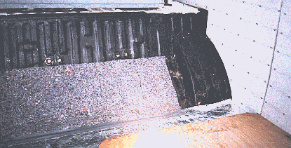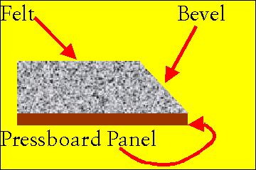 Using the interior panels as a template, we cut the felt, and adhered it with spray adhesive to the panels. IMPORTANT: once you have fastened the felt soundly to the panels and allowed the panels to cure (a day), you must take a sharp pair of shears and bevel the edges of the felt everywhere the fabric will wrap around. Here's a close-up: (our visual learners are saying, "Thank God!"