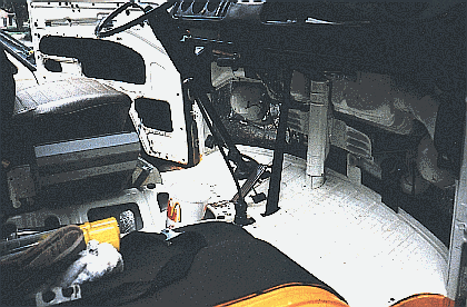 The Driver's seat has been diassembled and re-stuffed (MUCH more comfy!). There is a large McDonald's cup, belying my extreme thirst in the July heat. The passenger side seat arch is covered with Q-Pads and Kool Patch. You see my boom-box leaned up between the seats. Finally, there are two cans (lower left) of foam expansion sealant ready to fill the voids somewhere, (probably the void over the top of the windows in the door; this required a long hose, and some patience). There is a leather glove and rags next to the cans of foam. You will need both.