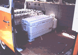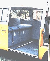 Finished Product. Double bed futon folded up behind our new rear "seat". Cooler drains through a hose through the floor. |