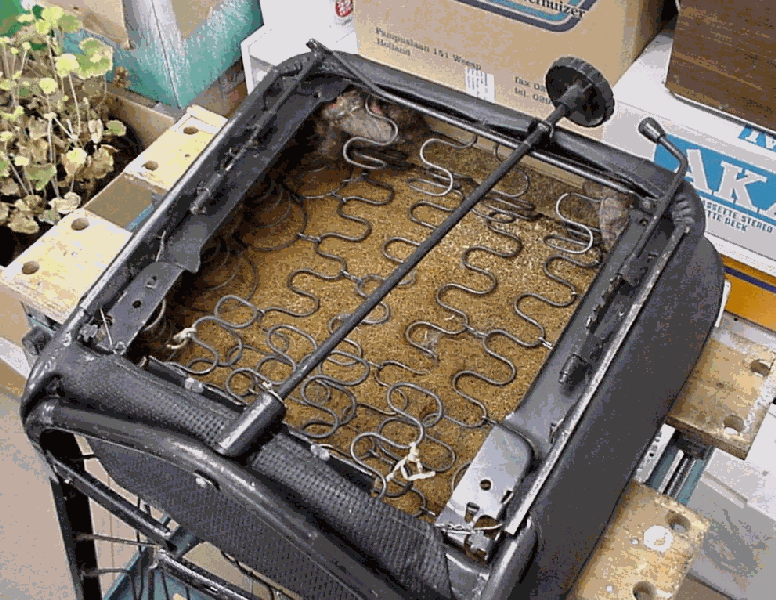 Now you inspect the sides of the base. Here you see two pieces of wire coming through the seat frame. Either you cut them off or unwind them, but be sure to dispose of the remains of these wires. Otherwise they may cut your covers later!