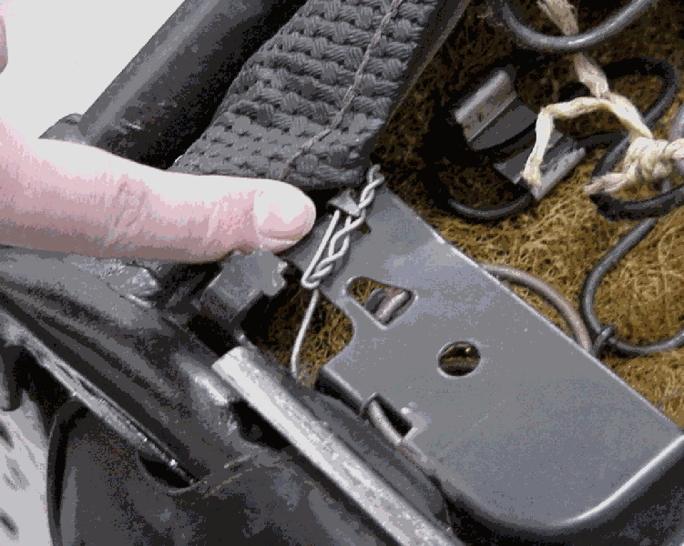 Once the wire is in, hook the metal tabs at the front of the seat back into place. Slide the wire trought the back section of the cover as well. Make sure it is routed correct over the adjustment rod in the middle (the shortest way is best) engage these lips here also. Now insert the small pieces of wire near the seat rails. Pull them tight while holding the seat frame down (seat in the upside down position) and twist them and the same time (patience test #2). Cut any excess wire off and fold it out of the way so you will not cut yourself later. Now it is time to pull the "cover" wire tight. If you have a helper handy let him/her press down the seatframe a little so you have the opportunity to secure the wire end to the frame (patience test #3).