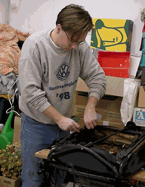 Above you see where I just have cut one of those wires. In total there are four of them. Now you have undone all the attachments from the "main" wire to the frame. Next cut the wire at the joint (as seen before in detail). I prefer to cut it on both sides of the backrest. This way you can pull this section out more easily. Make sure you leave enough "flesh" to pull the rest of the wire out which goes along the frontside. At first it might seem that the wire will not give in, sure it wont!! It has been there for about of a quarter of a century Once the wire is out you can pull off the seat cover. Chances are you will again face a partly disintegrated horsehair padding. Clean up your working space and check whether the seat frame has survived in one piece. Check the backrest bottom crossmember; is it cracked? Mine was, it can be fixed with some welding. On the 76-79 versions I frequently spotted broken main (upright) sections of the backrest frame (these seat types are also used in early vanagons). Again the welder has to come into action. Check the springs; are they broken? Before reassembling make sure your frame & springs are in tip-top condition. It might be nice to impress your friends with your expert retrim once your finished?! Imagine the comfort once you are done, not to mention the satisfaction of the job done properly.