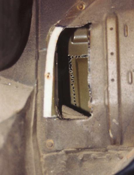 I wanted to obtain the most original result possible, so I also drilled & chiseled out the two holes for the exhaust & air intake pipe. I felt most comfortable drilling upwards, with safety goggles. There was enough ground clearance to crawl half under the panel you need to work on. Because I found the recirculating version I also made a hole in the D-post. Although you need to follow to cut along the recession in the panel here (on my '76) I made sure to double-check it with my templates. Better safe than sorry.... Because the edges of the hole are visible through the intake grille I took my time to dress up the edges & the inside of the fresh air intake cap.