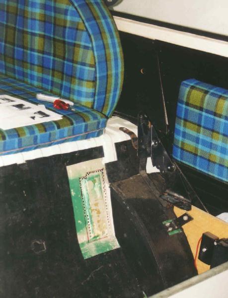 Again, double check your dimensions with the templates (either from Ron or Me) and mark in advance with your trusty felt pen. Because this panel is slightly curved you need to centre the position here before you can successfully drill the hole. As an exception to the rule the grommet where the bowden cable goes through can be ordered through your VW dealer (at least in Holland). The other hole for the cable, as you might expect, has to be drilled at an even more awkward position; above your brake master cylinder!! Hint: slide a piece of copper pipe over your drill so you won't protrude too far (about 10mm). In order to drill this one you need to take out your front seat. By this time your bus looks pretty messed up...
