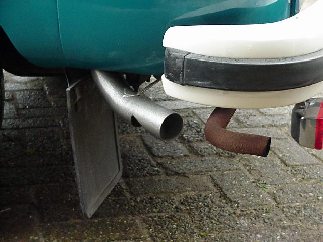 The exhaust of the later type is directly behind the rear wheel. Unless there is a mudflap it will get the full spray from the wheels. This frequently results in detrimental effects. I was lucky that only the upper part was terminally moth eaten. After some reviving the lower part looked excellent with some Hammerite brand paint. The exhaust lower part is made of considerably heavier gauge steel, so it survives longer.