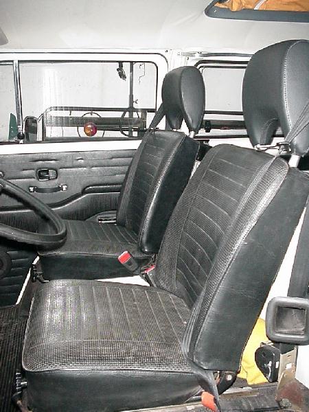 Below you see the paddings as I got them from TMI. They arrived flatpacked; I ordered two sets for both front seats. I installed a "real" passenger seat (which adjusts and everything) by welding "driver" seatrails on the other side. Because my bus was original an army vehicle there where no mounting points for a passenger seat whatsoever. So after careful measurements I welded those rails into place. Although my bus is a 76 allright, it has 68-74 rails installed as original equipment, maybe this was to upset any Russians?! Thats how come I had to do two earlier driver seats. I do not know for sure if these paddings also fit an original passenger seat for a type 23 (with walk thru).