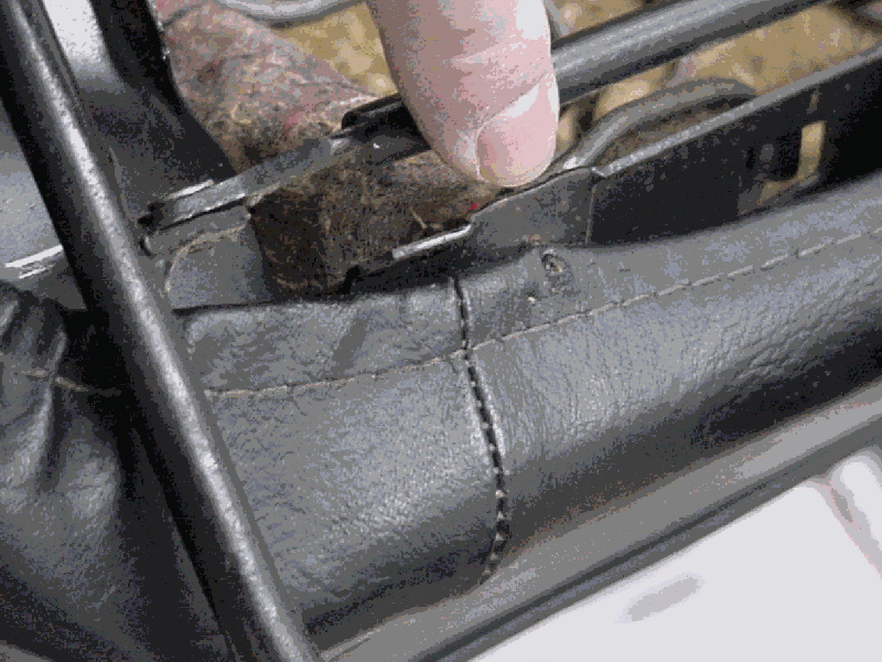 After a while you will have pulled that cover all over the backrest. Now put your knees on the bottom cushion in order to slide the front flap through to the backside with the wire in it. This has to be engaged to the metal tabs at the back. Do the same with the backside flap. Now gently taper these tabs flat so they do not stick out anymore, making sure they will not break in the process. If you do so; it is welder time again!! Finally, insert the headrest with its bushes.